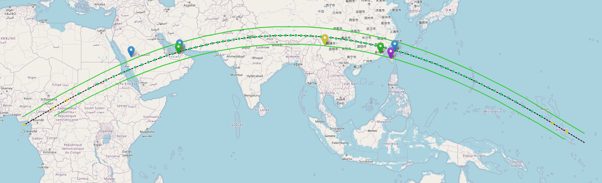 خارطة موضح عليها مسار الاحتجاب والمناطق التي يمكنها رؤية الاحتجاب، وهي الواقعة بين الخطين الأخضرين