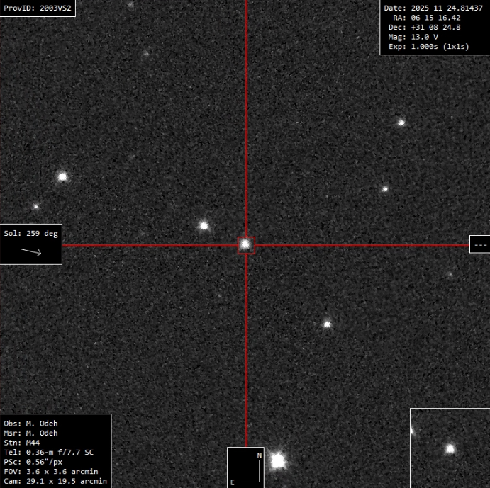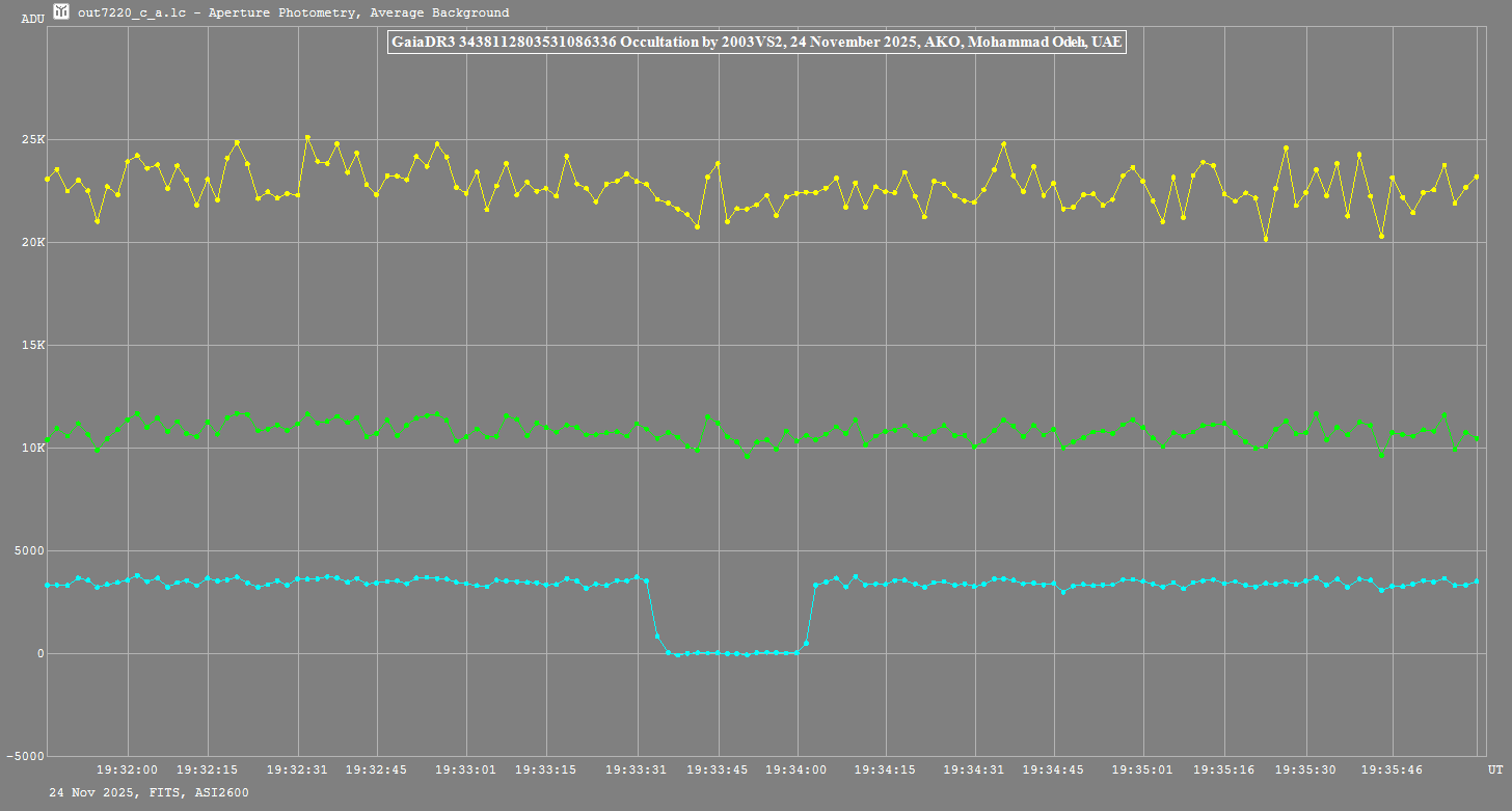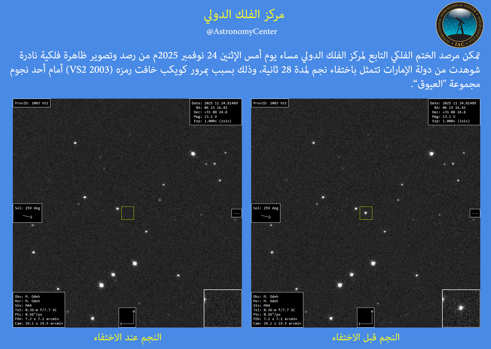 تمكن مرصد الختم الفلكي التابع لمركز الفلك الدولي مساء يوم أمس الإثنين 24 نوفمبر 2025م من رصد وتصوير ظاهرة فلكية نادرة شوهدت من دولة الإمارات تتمثل باختفاء نجم لمدة 28 ثانية، وذلك بسبب بمرور كويكب رمزه (2003 VS2) أمام أحد نجوم مجموعة "العيوق" يلمع بالقدر 12.7، أي أنه لا يشاهد إلا من خلال التلسكوبات.