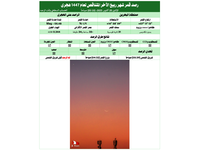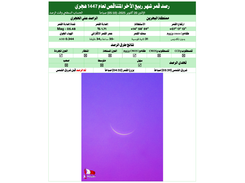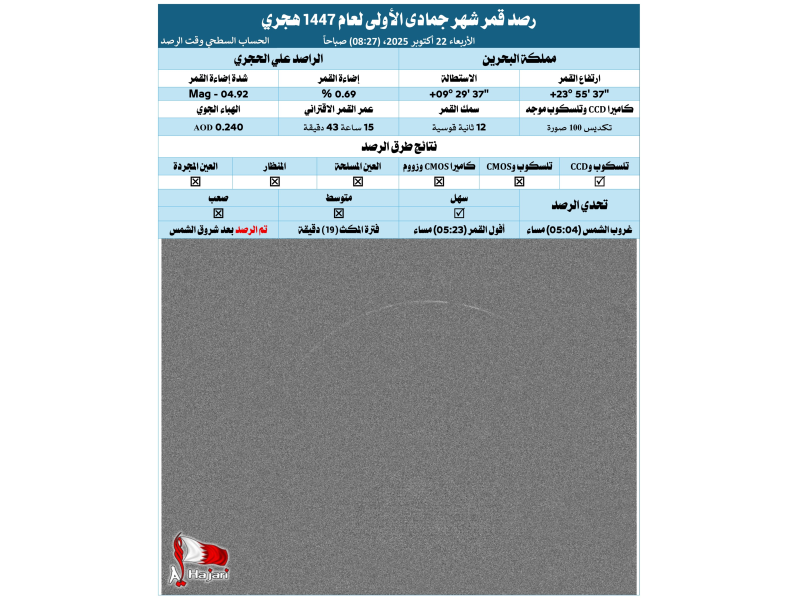 وقال عضو المشروع السيد حسن أحمد حسن "الجو كان ضباب و هواء ملوث جدا اليوم مع ذلك تم رؤية هلال على رغم من صعوبة بداية الشهر جمادى الأولى يوم الخميس 23 أكتوبر تشرين الأول عام 2025
