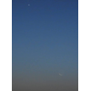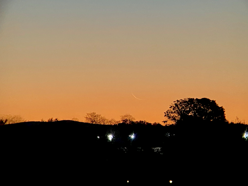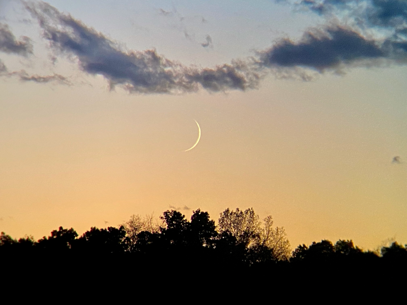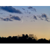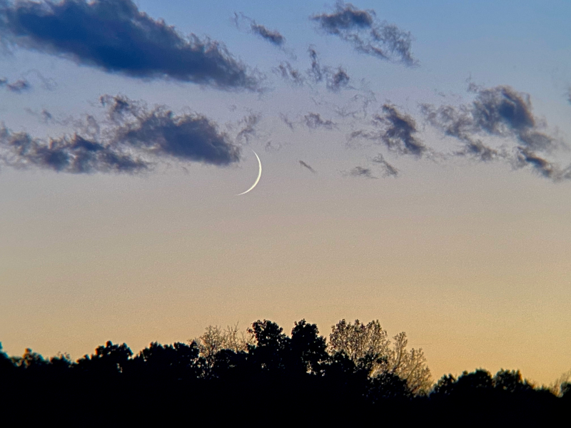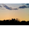 Later in the day, I arrived at my observation location at 6:08 PM (actual sunset was at 6:28 PM). The western horizon was partly cloudy and hazy. Using the binoculars, I sighted the crescent moon at 6:13 PM. My first naked-eye sighting was at 6:18 PM with glasses, and without glasses at 6:31 PM. The horns of the crescent moon were approximately positioned at 1:30 and 6:00 o'clock (1:30; 3:00; 6:00). Optical aid sightings of Mercury and Mars occurred at 7:09 PM and 7:11 PM, respectively. I believe these sightings could have occurred earlier if I had not waited for the apparent moonset (around 7:09 PM) behind distant trees—actual moonset was at 7:20 PM."