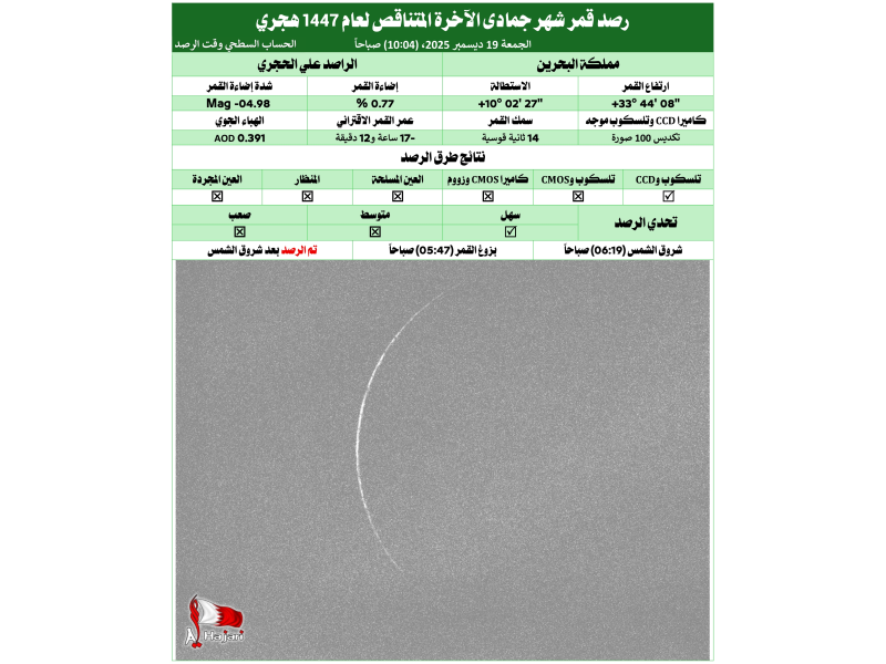 1 . وقت الرصد: بعد شروق الشمس .تم تصوير الهلال: ذكر عضو المشروع المهندس علي مجيد الحجري من مدينة عيسى في محافظة الجنوبية ان السماء (نسبة الغيم) كانت غائمة جزئيا والحالة الجوية كانت صافية جدا ولم يتم تحري الهلال بالعين المجردة ولم يتم تحري الهلال بالمنظار ولم يتم تحري الهلال بالمرقب وتمت رؤية الهلال باستخدام الكاميرا