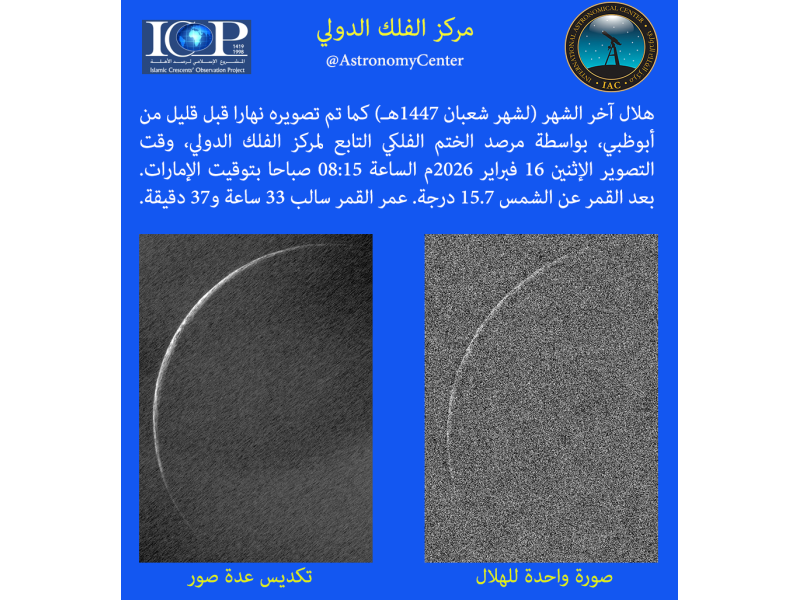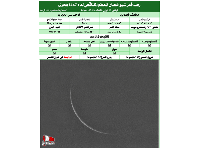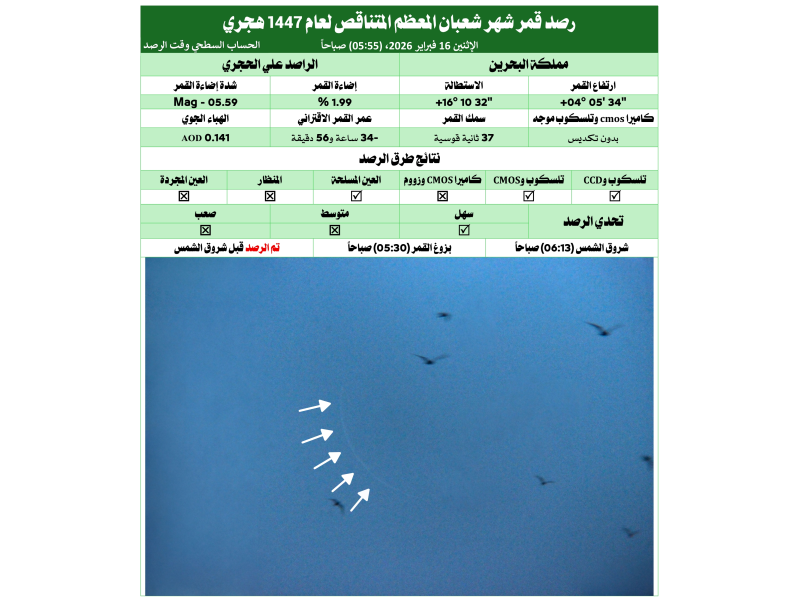 وقال عضو المشروع المهندس علي مجيد الحجري "تم تصوير قمر شهر شعبان المتناقص صباح هذا اليوم الاثنين 16 فبراير 2026 بتلسكوب موجه وكاميرا CCD و CMOS قبل شروق الشمس."